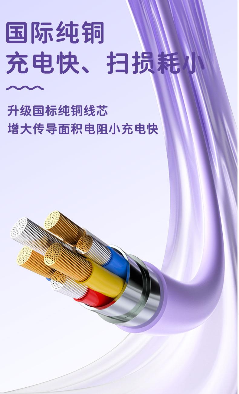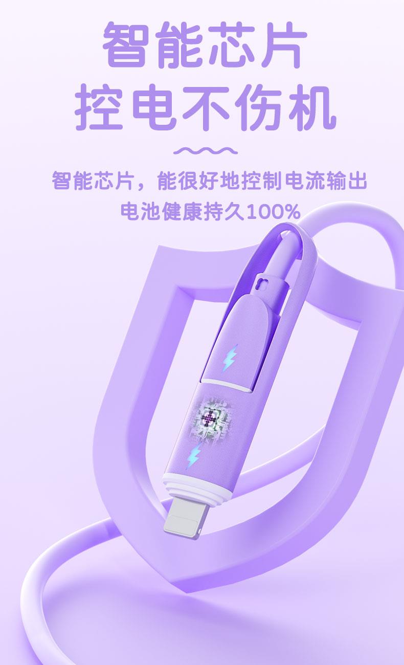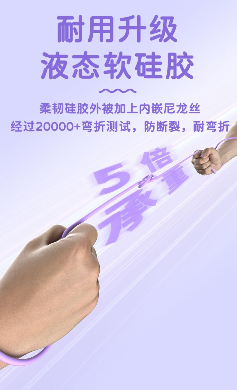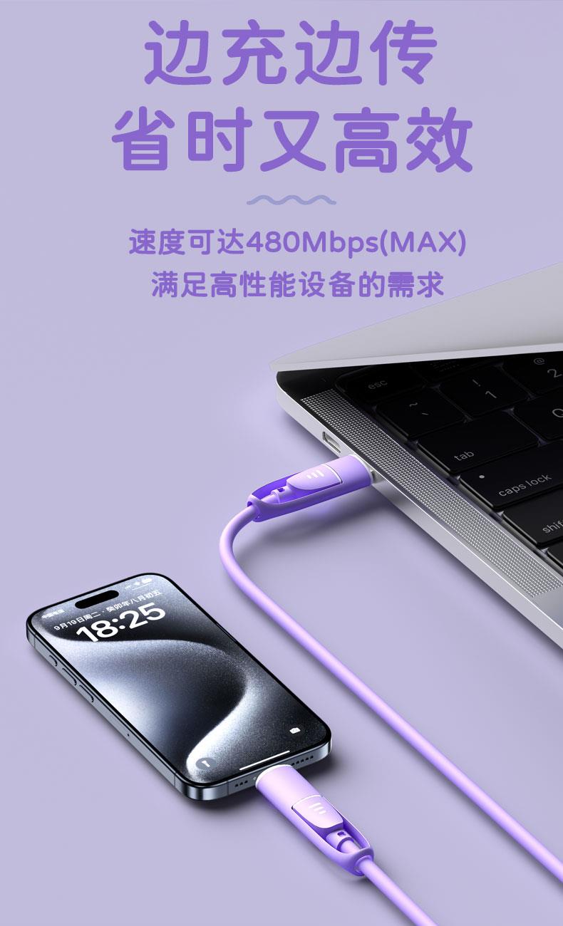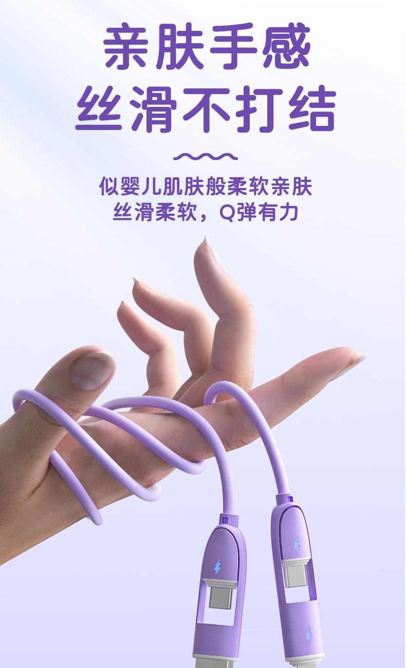 S6四合一66W超級(jí)快充硅膠數(shù)據(jù)線 顏色:綠色 紫色 黑色 粉色 白色 材質(zhì):編織線 尺寸:1M 包裝:彩盒包裝 【功能特點(diǎn)】: A/C口二拖二設(shè)計(jì),兼容蘋果15以上充電 66W超級(jí)快充,充電更快, C-C 66W / C-L27W 液態(tài)硅膠線,一體成型充電頭 1米長度設(shè)計(jì),使用方便 親膚手感,絲滑柔順不打結(jié)