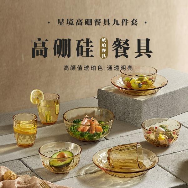 適用溫度:-20°C-200°C 材 質:高硼硅玻璃 產品參數:小碗460ml*3、 杯260ml*3、 盤196mm*2、大碗1000ml 彩盒尺寸:415*90*408mm 外箱尺寸:43*37.8*42.2cm 產品賣點:1.產品采用高硼色料玻璃材質,顏色與生俱來,永不退色。烤箱、微波爐、冰箱冷凍放心使用。 2.星境高硼餐具設計理念,用線條勾勒幾何切面,以面為境折射時光、徜徉星空。 3.觸感溫潤,質感光滑,為您的餐桌增添一抹高雅。